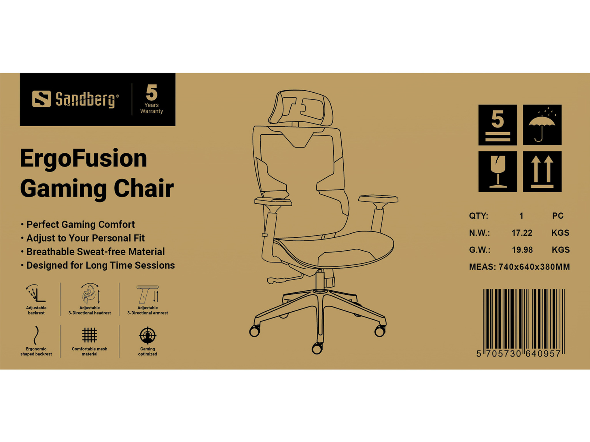 Įsitaisykite „Sandberg ErgoFusion“ žaidimų kėdėje ir mėgaukitės prabangia ergonomiška forma. Patogumas daugybei valandų, nesvarbu, ar žaisite ar dirbsite. Didžiausias komfortas dėl daugybės reguliavimo parinkčių, leidžiančių pritaikyti kėdę jūsų poreikiams. Sėdynės aukštis ir gylis reguliuojamas individualiai, nugaros kampas reguliuojamas ir fiksuojamas 4 padėtyse. Reguliuojamas galvos atramos aukštis ir kampas. Sėdynė ir atlošas padengti kvėpuojančiu tinkleliu ir PU medžiaga. Pagaminta iš tvirtų, aukštos kokybės medžiagų, užtikrinančių ilgaamžiškumą. Suteikiama 5 metų garantija.